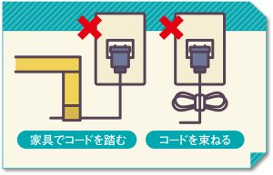 その他の注意点としては、電源コードに傷や破れがないかを確認し、あれば使用を中止してください。また、家具でコードを踏んでいると半断線で、コードを束ねて使用すると過熱して火災の原因になります。コード類は束ねず、適切な長さで使用しましょう。プラグを差す時は、接触不良にならないよう奥までしっかり差し込み、抜く時は断線の原因になるため電源コードではなくプラグ部分を持って抜きましょう。