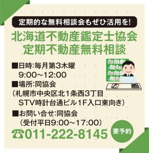 北海道不動産鑑定士協会では定期的に無料相談会を実施しておりますので、ぜひお気軽にご利用ください。新型コロナウイルス感染症対策のため、従来の対面による相談は休止しておりますが、お電話やオンラインによる相談形式にて、受け付けております。予約制になっておりますので、当協会までお問い合わせください。 不動産鑑定士は、不動産の価格を適正に判定できる唯一の国家資格です。 【取材協力】 公益社団法人 北海道不動産鑑定士協会 TEL011-222-8145 http://www.harea.or.jp